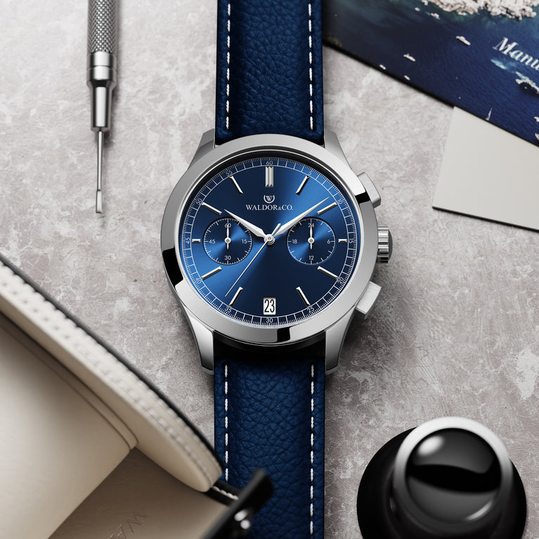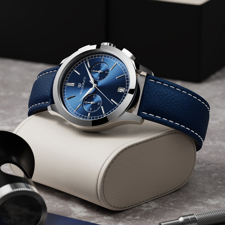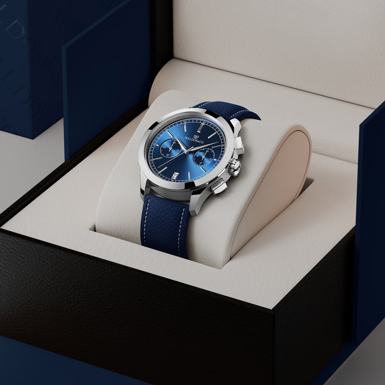 Strap: Genuine blue leather, clasp in rhodium-plated stainless steel