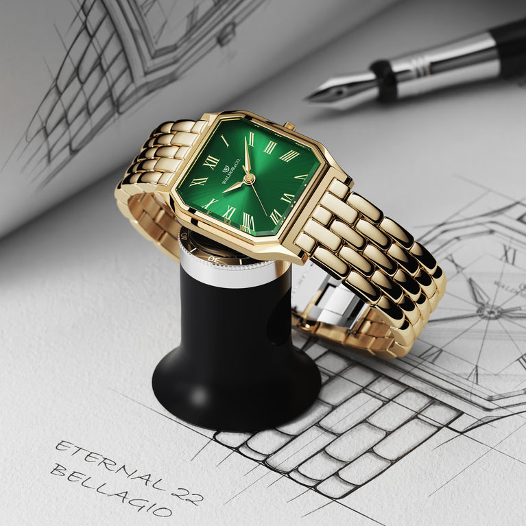 At the heart of the Eternal 22 Bellagio is its green sunray dial, made from the finest brass. The green shade is enhanced with a sunray effect that catches the eye with its shifting play of light. As the dial is exposed to the sun, it creates a dynamic depth, making the green not just a color, but a lively, engaging element of the watch's design.