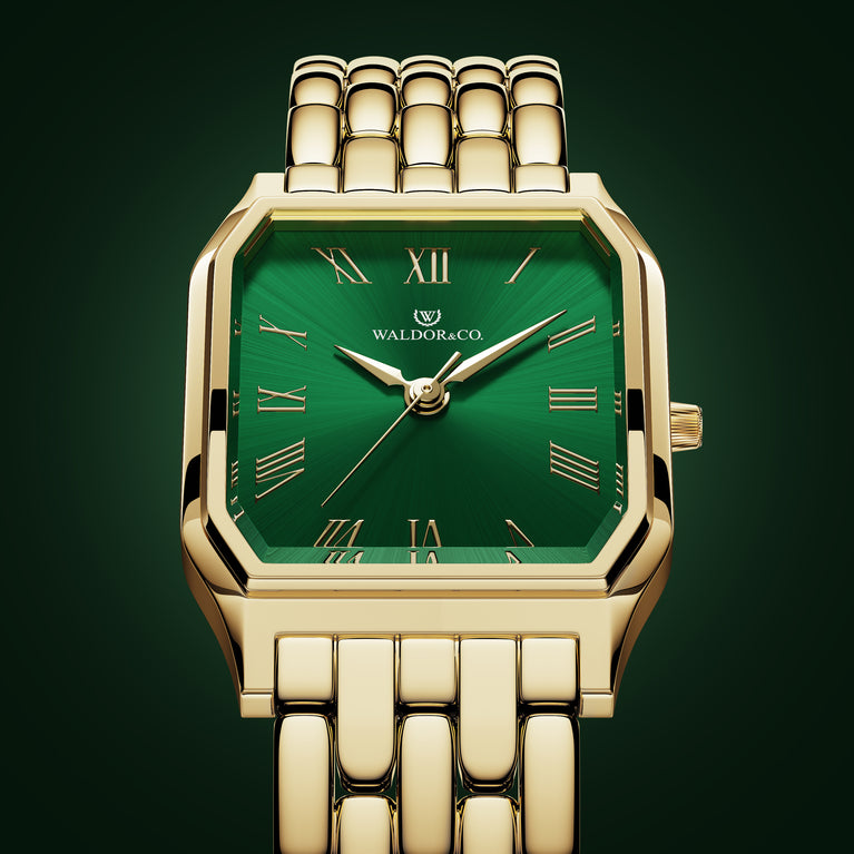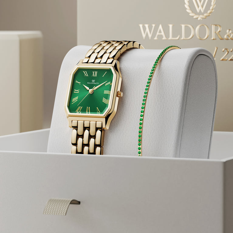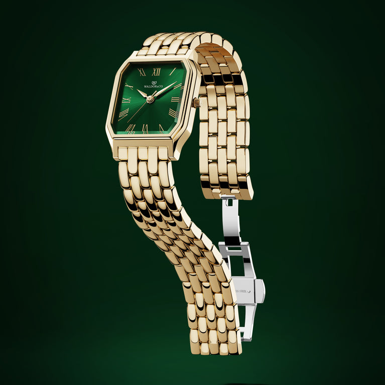 A square womens watch in 22k gold from Waldor & Co. with green Diamond Cut Sapphire Crystal glass dial. Seiko movement. The model is Eternal 22 Bellagio.
